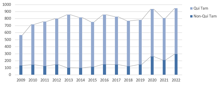 The data demonstrates a continued upward trend of government enforcement under this administration, with 296 new matters initiated by the government, compared to 212 in the prior year. Government initiation is still significantly outpaced by whistleblowers, who filed 652 qui tam suits in fiscal year 2022, compared to 598 in 2021.