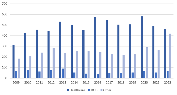 Also notable this year is the total number of "other" cases beyond healthcare and DOD. There were 418 cases in the "other" category, up from 266 and similar in years past: