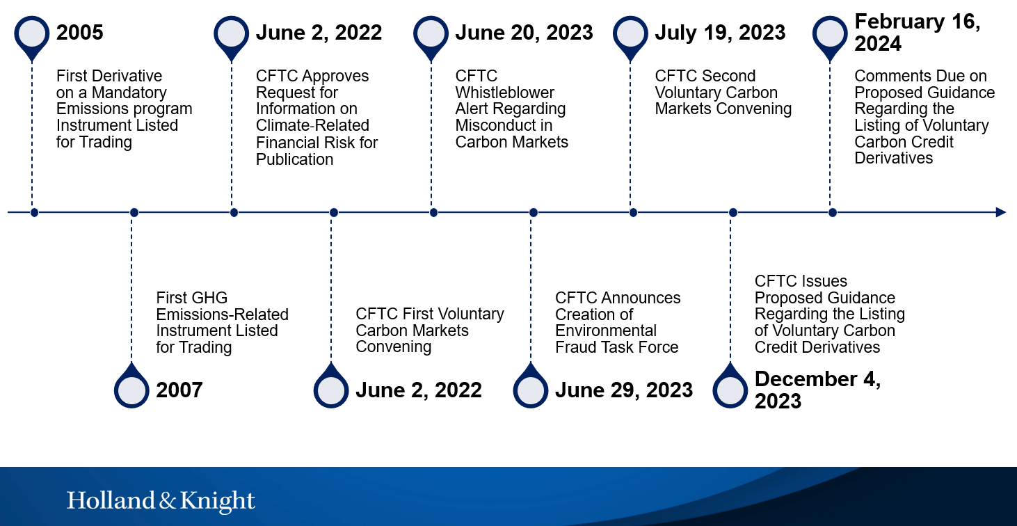 The Commodity Futures Trading Commission (CFTC) issued proposed guidance (the Proposed Guidance) regarding the listing of voluntary carbon credit (VCC) derivatives on CFTC-regulated exchanges on Dec. 4, 2023.1 The CFTC's goal is "to advance the standardization of voluntary carbon credit derivative contracts in a manner that fosters transparency and liquidity, accurate pricing, and market integrity."2 Over the past few years – ramping up especially in 2023 – the CFTC has been attempting to impose standards on the voluntary carbon market with limited statutory authority (see the timeline below). The Proposed Guidance is one way the CFTC can do so within its authority.