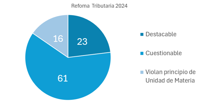 Bajo estos tres ejes, nuestra visión de la reforma tributaria es la siguiente, al considerar que el proyecto tiene 23 por ciento de normas destacables, 61 por ciento de normas cuestionables y 16 por ciento de normas que podrían estar violando el principio constitucional de unidad de materia, de acuerdo con el número de normas que enseguida pasamos a comentar en forma concreta:
