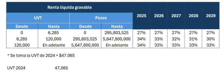 A la cabeza se encuentra la reducción gradual de la tarifa de impuesto sobre la renta para personas jurídicas, bajo una fórmula para cuantificar el impuesto con la cual se modifica el Artículo 240 del Estatuto Tributario (ET) y que dejaría las tarifas marginales así: