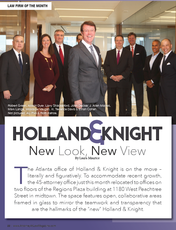 Atlanta Executive Partner Allen Maines sat down with Attorney At Law Magazine to discuss the office's recent growth and new lateral hires. To accommodate the expansion, Holland & Knight's 45-attorney office has relocated to offices on two floors of the Regions Plaza building at 1180 West Peachtree Street in midtown.