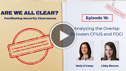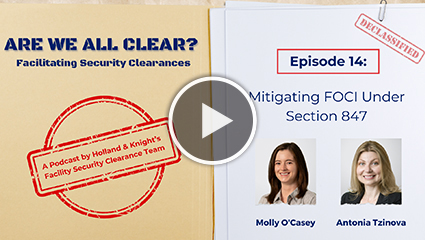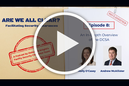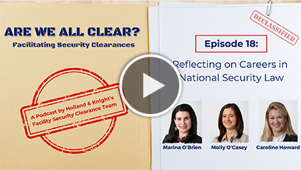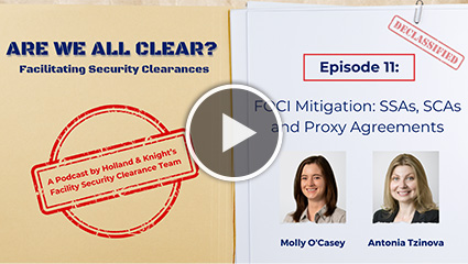 U.S. government agencies grant access to classified information only on a need-to-know basis. Correspondingly, we know what clients need to obtain and maintain FCLs. Holland & Knight's Facility Security Clearance Team assists federal government contractors in submitting a sponsorship letter, the initial facility clearance package and key management personnel (KMP) lists, negotiating FOCI mitigation with DCSA, and structuring their organizations through all types of transactions so that clearances are processed smoothly or preserved. Clients rely on our deep bench of attorneys, many having more than a decade of facility clearance and industrial security experience, to counsel them on an array of issues surrounding their clearance matters.