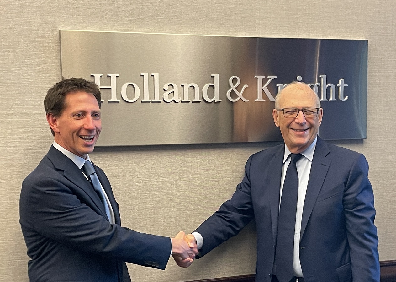 Matt Burnstein and Steve Sonberg shaking hands in front of Holland & Knight logo